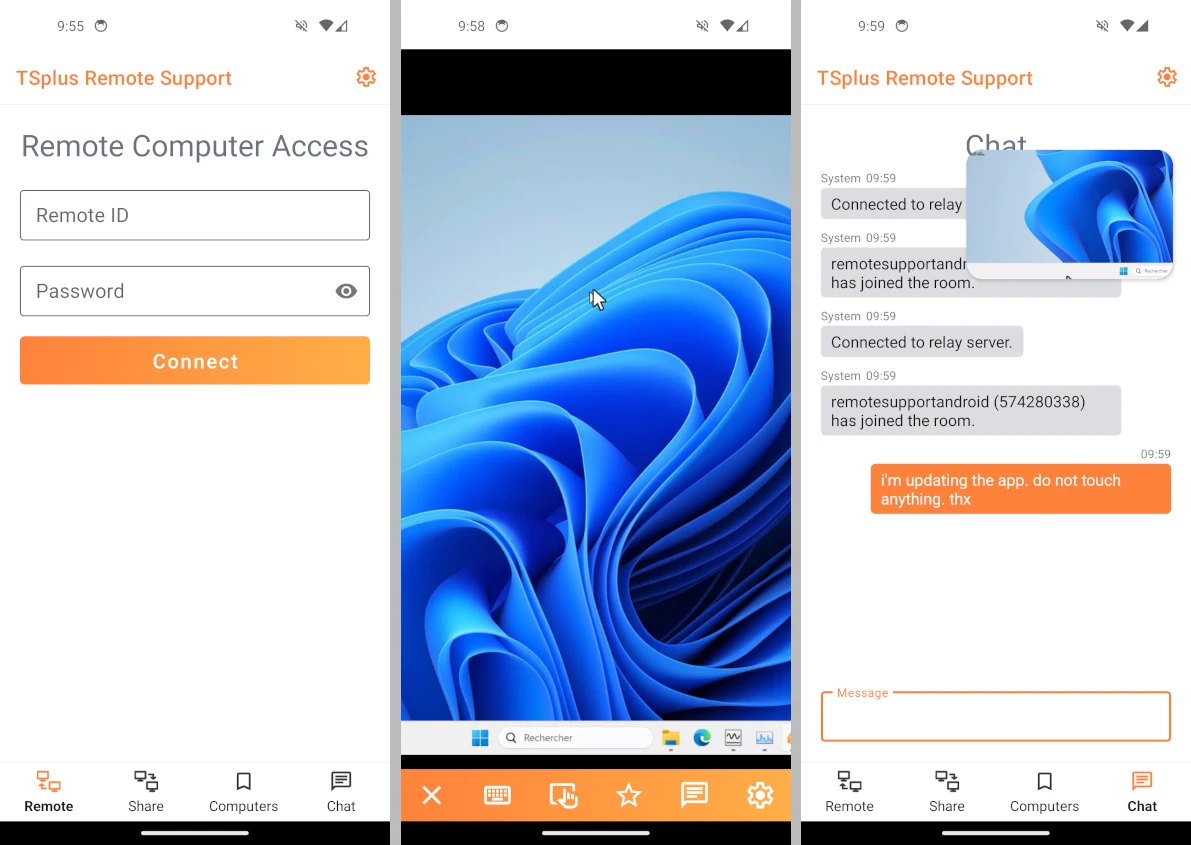 TSplus automatically manages and updates both servers and clients.Any outdated remote support client upgrades itself on launch, ensuring users always access the latest features and fixes.