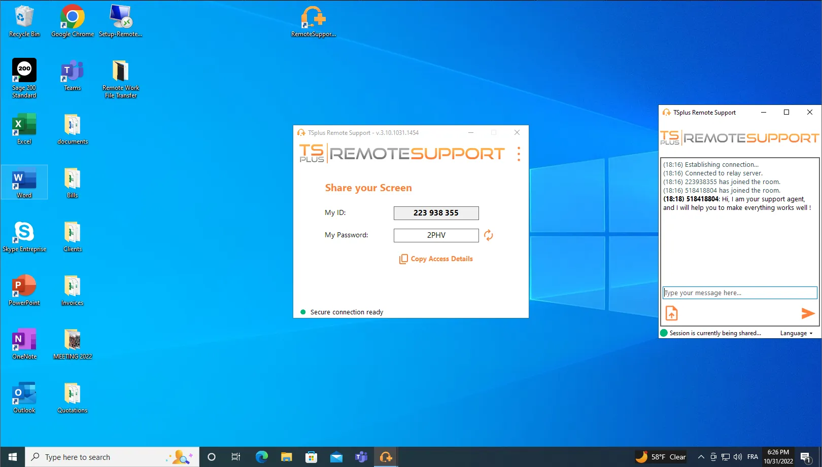 Agents can take control of the screen, mouse, and keyboard of remote clients. The end-user can allow the agent to take control in one mouse click. As soon as the end-user allows the connection, the chat box appears, and the remote support session starts.